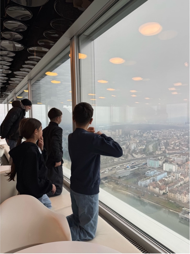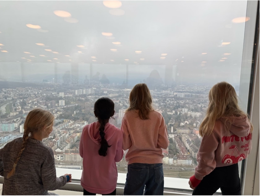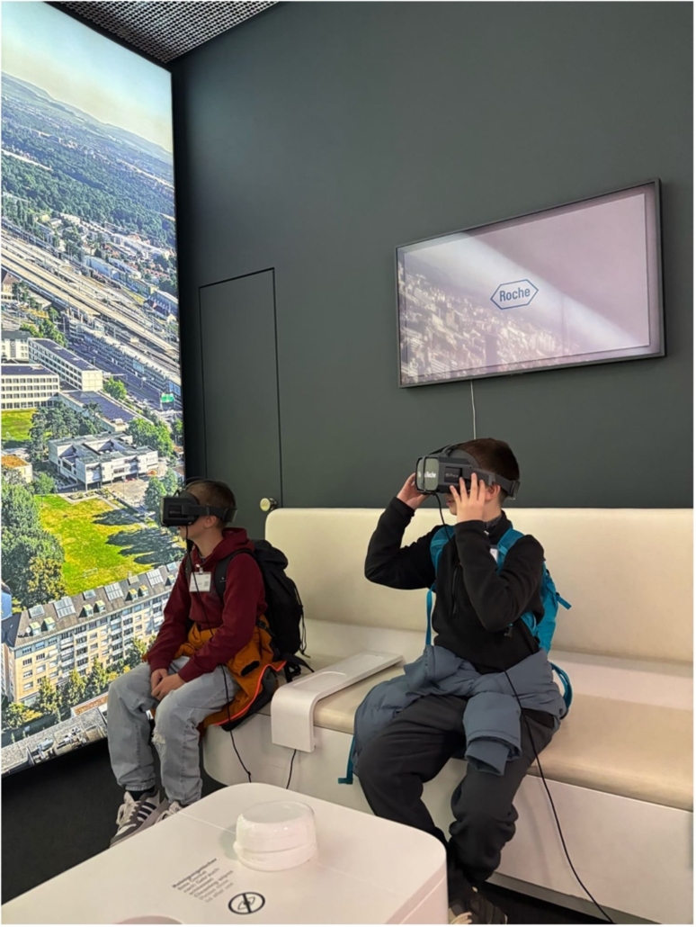 Auf der Reise nach Basel teilte sich unsere Klasse in 2 Gruppen. Die erste Gruppe spielte das Spiel “Werwölfeln”. Die zweite Gruppe redete und spielte nicht. Als wir in Basel angekommen sind wussten wir noch nicht was uns erwartet. Am Bahnhof SBB sind wir dann in den Bus gestiegen. Wir sind etwa 1 Stunde mit dem Zug und Bus gefahren. Bei der Station “Hoffmann-La-Roche” stiegen wir aus. Als wir dort angekommen sind, dachten wir, wir gehen auf einen Spielplatz oder so…aber wir gingen wirklich zur Firma Roche. Unsere Heilpädagogin hat uns vor dem riesigen Gebäude erzählt, dass wir bis ganz nach oben gehen dürfen. Wir sind zwar nicht in den höchsten Turm der Schweiz gegangen, das wäre der Bau 2, aber dafür durften wir ins zweihöchste Gebäude, in den Bau 1. Dieses hat 38 Stockwerke. Es war sehr toll, weil wir von dort oben bis auf Deutschland und Frankreich gesehen haben. Wir durften leider nicht raus auf die Dachterrasse. Es war trotzdem sehr cool. Anschliessend gingen wir nach unten ins Erdgeschoss. Da konnten wir noch ganz viel machen und ausprobieren. Wir durften zum Beispiel VR Brillen anziehen und so übers Roche-Gelände laufen.